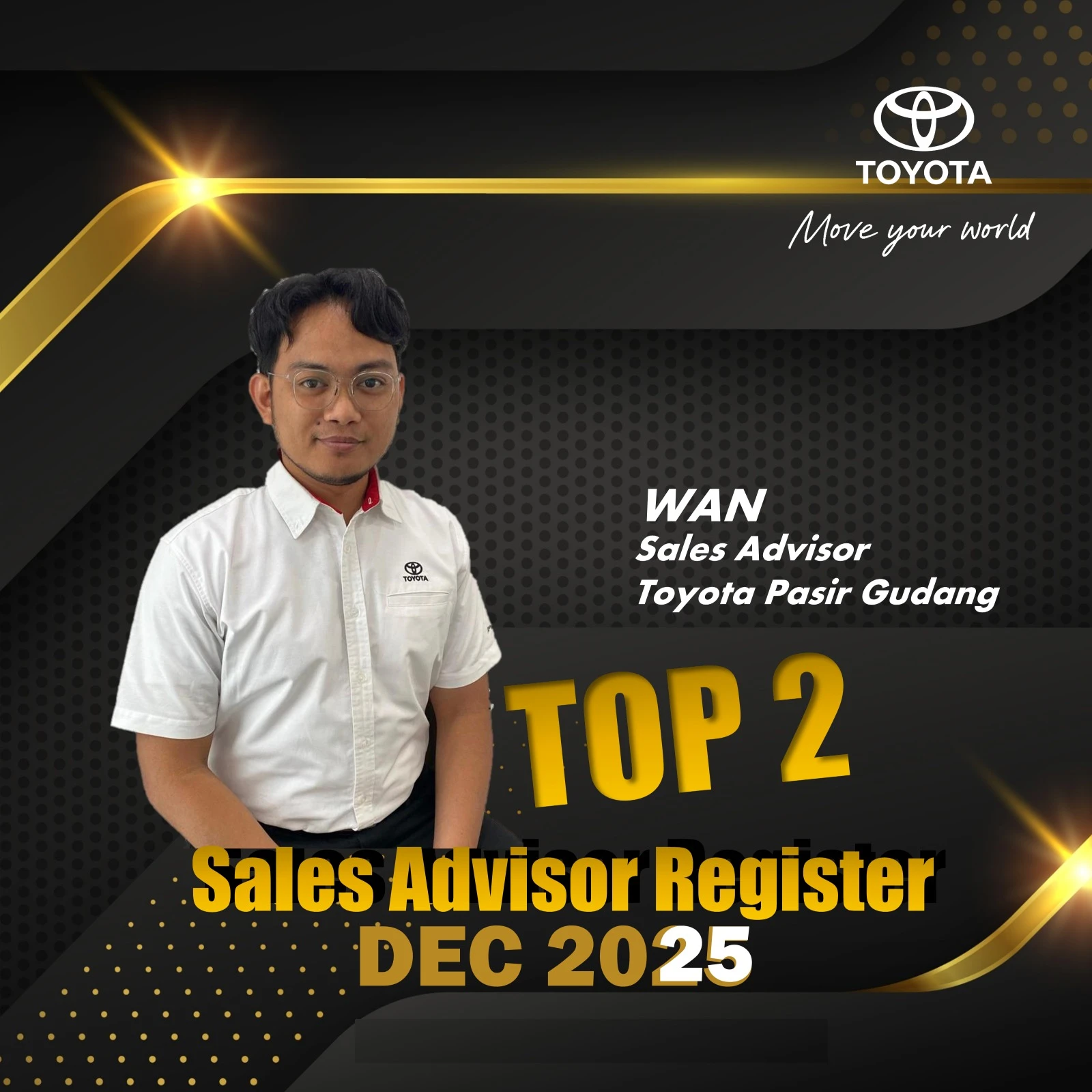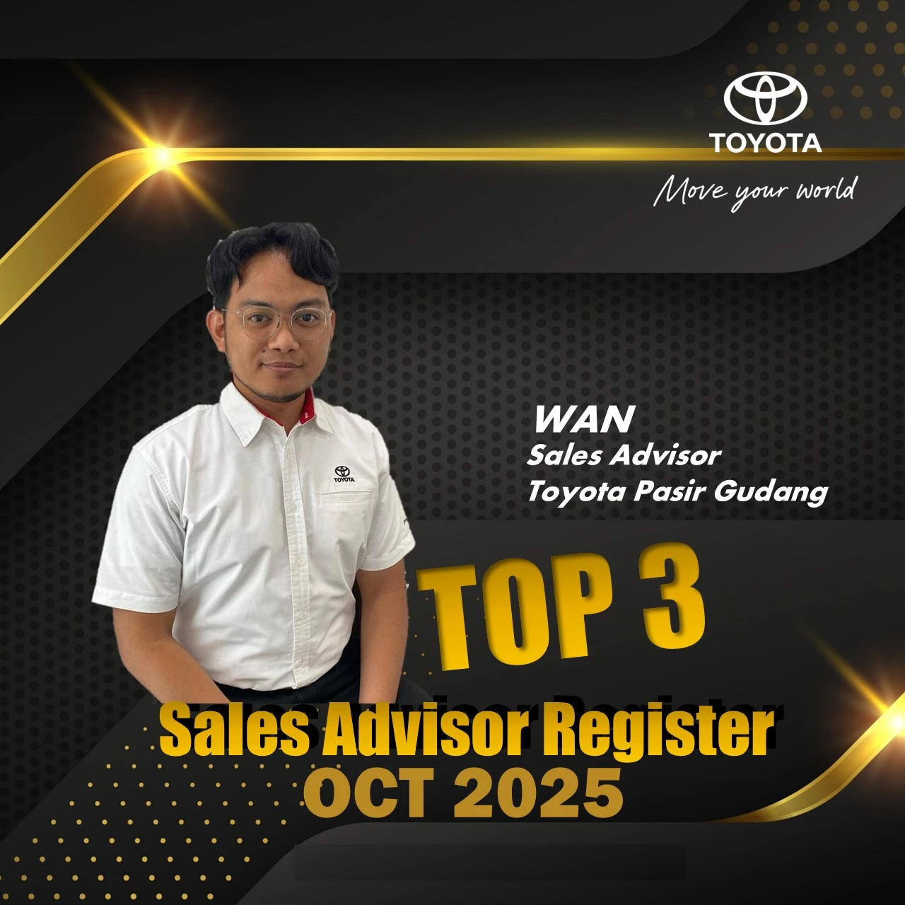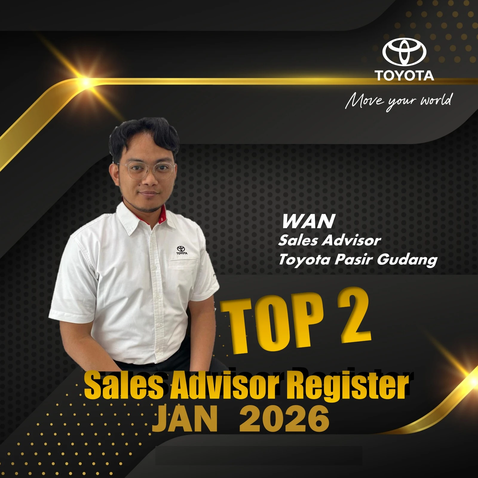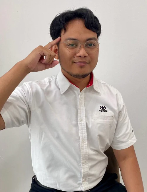 Hai, saya Syazwan, Penasihat Jualan Sah di Toyota Pasir Gudang. Dengan pengalaman 3 tahun dalam industri, misi saya adalah membantu anda memiliki kereta Toyota idaman dengan cara yang paling mudah dan telus.